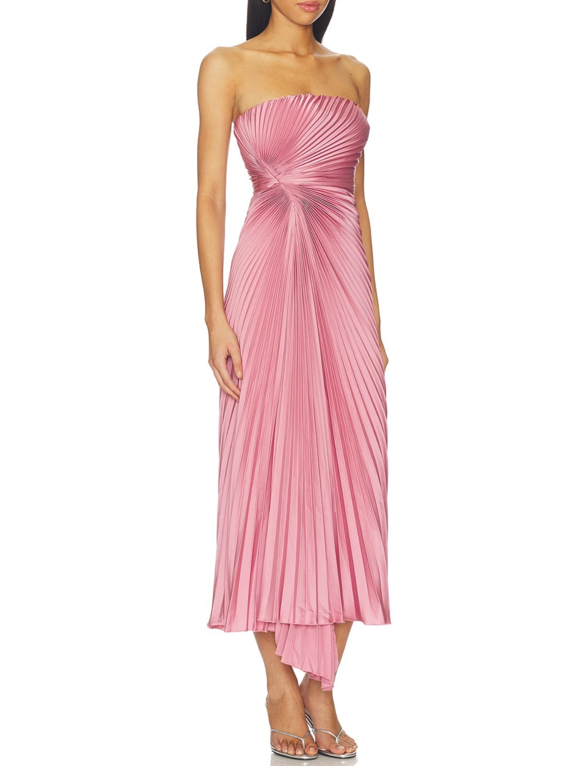 Asymmetric pleats wrap the body in smooth, radiant draping that catches the light with every step. A flattering fit that feels easy, yet makes an entrance.