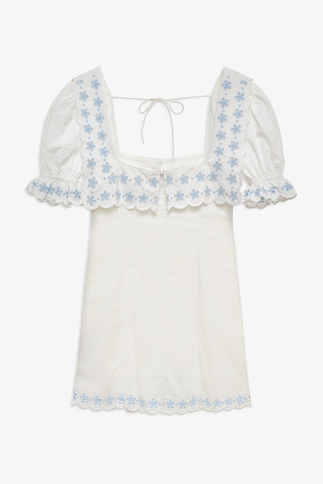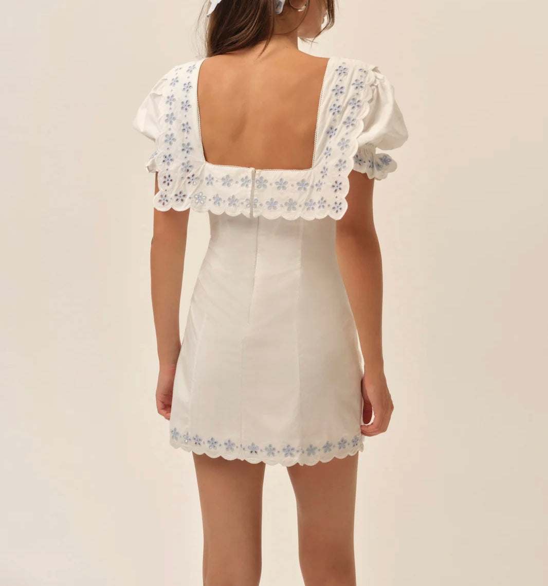 Clean lines meet romantic detail in this white poplin mini dress, where a fitted silhouette, puff sleeves, and an embroidered collar feel equally at home seaside or strolling cobblestone streets.
