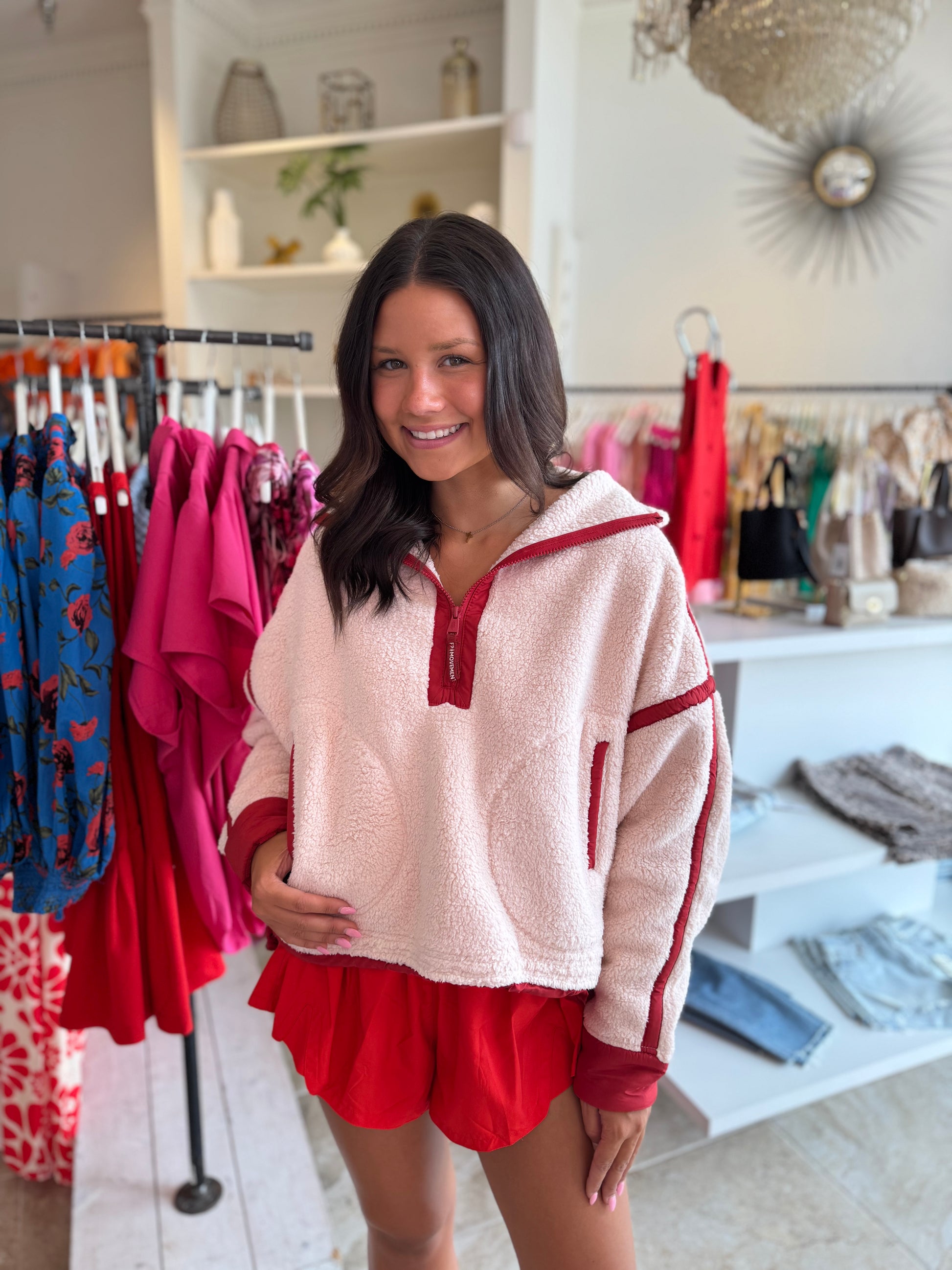 Cozy fleece pullover featuring a half-zip closure and high neckline with bold contrast seams throughout and an adjustable hemline.